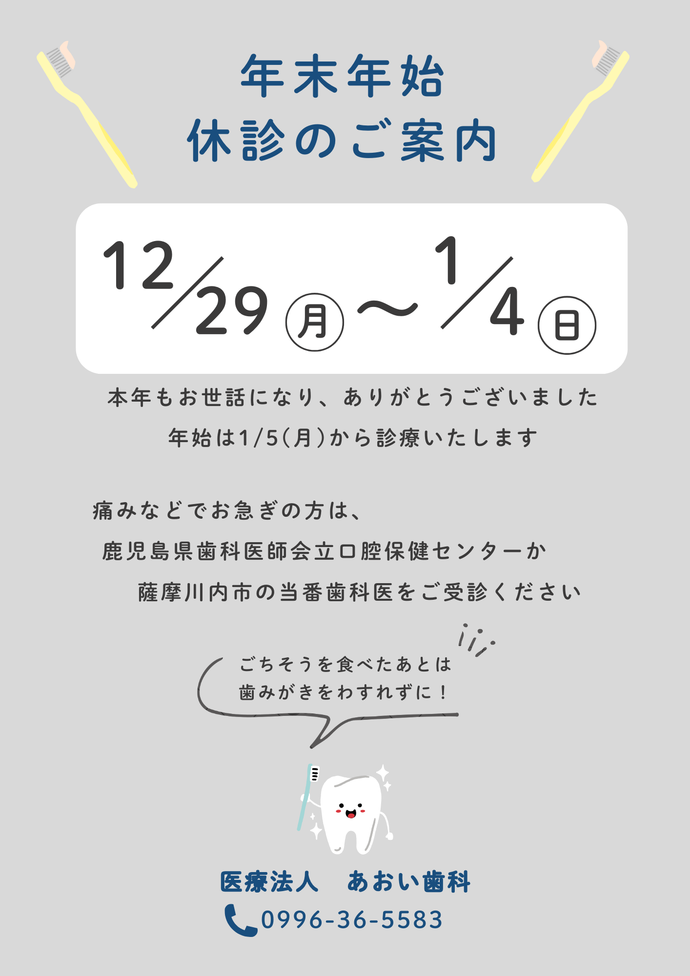 今年の診療は12/27(土)まで、新年は1/5(月)から診療させていただきます。